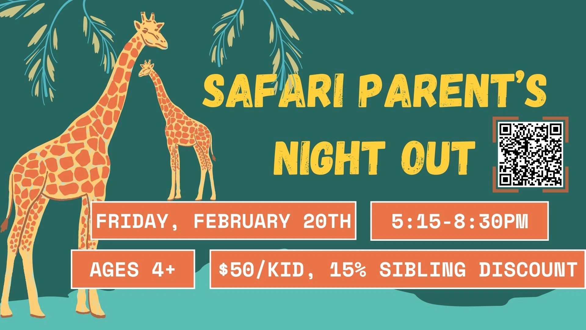 Get ready for a wild night of fun at our Safari-Themed Parent’s Night Out! Kids will explore the gym through exciting obstacle courses, jungle games, crafts, and open gym time!